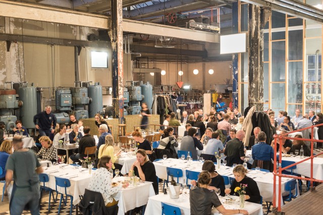 Restaurant Radio Royaal biedt lunch en diner aan op de eerste verdieping. Het karakter van deze rauwe industriële locatie met zijn imposante installaties, motoren en pompen, is behouden gebleven. De oude machines staan nog gewoon in de ruimte.