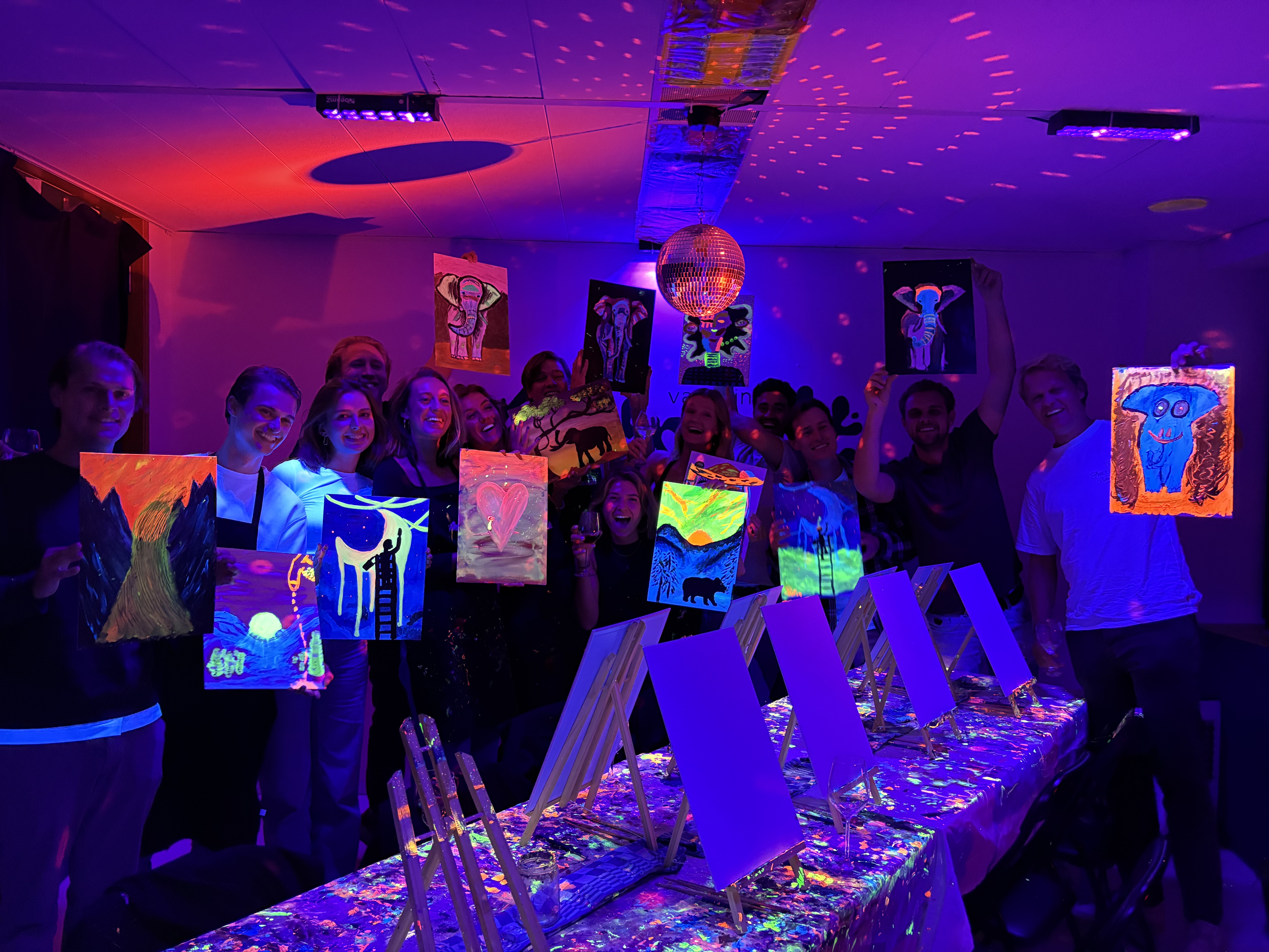We verzorgen schilderevenementen, met het normale licht uit en de black lights aan. We gebruiken niet alleen normale verf, maar ook neonverf. In combinatie met de black lights licht dat spectaculair op. Voeg daar een discobal, leuke muziek en iets te drinken aan toe en je hebt het perfecte recept voor een geslaagd avondje uit. Bij Rembrandt van Wine draait het niet alleen om schilderen, maar ook om mensen met elkaar te verbinden in een ontspannen en creatieve sfeer. We creëren de perfecte omstandigheden om nieuwe mensen te ontmoeten. Met onze 'Mission Solo' stimuleren we bezoekers om juist alleen te komen. Het concept is ontworpen om een toegankelijke en ongedwongen ervaring te bieden, waar iedereen makkelijk contact legt en zich vrij voelt om zichzelf te zijn.